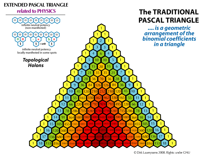 Frank Wilczek, Noble prize winner in Physics, points to the essence: “How is it possible to construct heavy objects out of objects that weigh nothing?. Only by “creating mass out of pure energy.” (see Wilczek video info below) Creating Mass out of Pure Energy. That is what I shown on above animated image. That image is topological fully correct. The dynamic Membrane represents the pure energy. I call that "neutral" energy, since it is not manifested yet. Separated membrane peaks couple/merge by a penetration action. They make a new union, that will act as a whole (a unit, called a holon). That union has three (local) membrane layers. Not 2 layers, but 3 layers. Not 4 layers, but 3. This local unit has a central vertical peak (the pusher, the force, yang) that is covered by 2 layers of the passive horizontal tube (yin). Thus the "unit" has duality since it contains a force part (+) and a dependent part (-). However the "unit" is still connected with the large (Mother Membrane), and a part of these connections are not in the unit itself. The act of penetration (that I call Pelastration) is orthogonal. In the second stage we see in the animated gif that the central (black) layer will create by it's vibrations again two separate peaks. One passive peak and an active peak, and again - following the same pelastration principle explained above - will make a new - more complex - holon. This approach explains the essential difference between bosons and fermions. Indeed we see how the vertical action is related to the energy (since we can add up energy like in lasers), and how the horizontal action is related to "cooling" (passive) energy that becomes "structure" (mass, matter). In the animated image we see how stepwise the adding of more and more layers happens. By adding layers the local structure becomes more dense (weigth, mass) and become more rigid (hard, less flexible). That's the geometrical answer to Wilczek's question: "How creating mass out of pure energy ?". You can check the Wilczek video on http://mitworld.mit.edu/video/253/ ==quote from the abstract about that video== Perhaps the universe is not so much strange as brimming with lovely paradox. The search for such beauty seems to lie at the heart of Frank Wilczek’s work. Twentieth century physics, from Einstein through Wilczek’s own Nobel Prize-winning efforts, involves demonstrating the existence of a topsy-turvy reality: for instance, that such sub-atomic particles as quarks and gluons, which have little or no mass, “orchestrate themselves into not just protons and neutrons but you and me,” according to Wilczek. “How is it possible to construct heavy objects out of objects that weigh nothing?,” he asks. Only by “creating mass out of pure energy.” These particles are essentially “excitations in otherwise empty space.” Says Wilczek: “That suggests something …beautiful and poetic: the masses of particles are not like, or similar to or metaphorically suggested by they are the tones or frequencies of vibration patterns in dynamical voids.” The theory of quarks and gluons and the strong interaction accounts quantitatively for “the mass of protons, neutrons and ultimately you and me and everything around us.” But physics has not yet squared away all aspects of the universe. Wilzcek says that “in cosmology, we meet our match, and don’t know what’s going on.” This is because scientists can’t account for much of the mass in the cosmos. 70% of this mass is in “dark energy,” which is pushing the universe apart. Wilczek hopes that explanations for the dark stuff will emerge through improving equations, unifying theories of different interactions and extending their symmetries. “Beautifying equations leads not to ugly consequences but beautiful surprises,” he concludes. ==endquote== We can analyse this approach by looking to the Pascal Triangle. To me that very nice approach is not complete. It doesn't show us where the chains of one's are coming from. In next animated image or movie I explain it. |