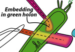 Onderaan zien we een rode holon die de groene hollon volledig pelastreert. De groene hollon is nu langs diverse kanten verbonden en maakt zo deel uit van een holon netwerk. |
